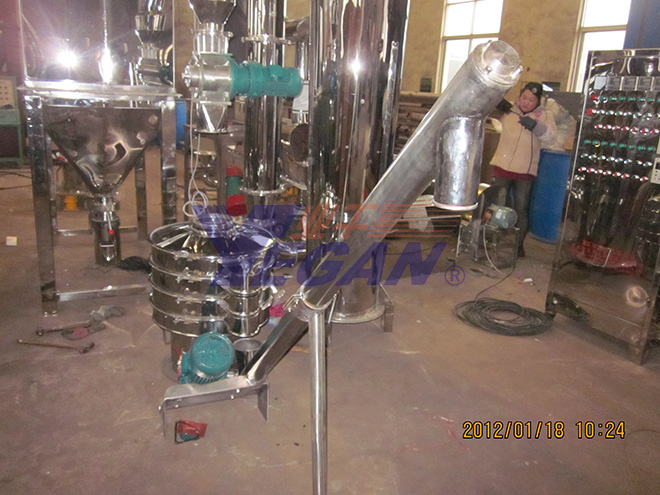 GFF型强化气流干燥机从原料进到成品出的全系统由热交换器、风机、加料器、一二级干燥管,旋风分离器,锁风装置,除尘装置及电器控制柜组成。
